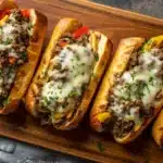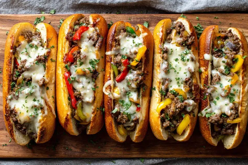 Tender, juicy ground beef is cooked with sweet sautéed onions and colorful bell peppers, then smothered in melty cheese and tucked into warm, toasted hoagie rolls. It’s rich, cheesy, and incredibly comforting—with all the bold flavor and none of the fuss.