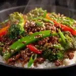 This spicy ground beef stir-fry bowl is a quick and fiery one-pan dinner that delivers bold flavor in every bite. Tender ground beef is sautéed in a savory chili-garlic sauce, then tossed with crisp-tender vegetables and served over fluffy, steaming rice for a satisfying and balanced meal.