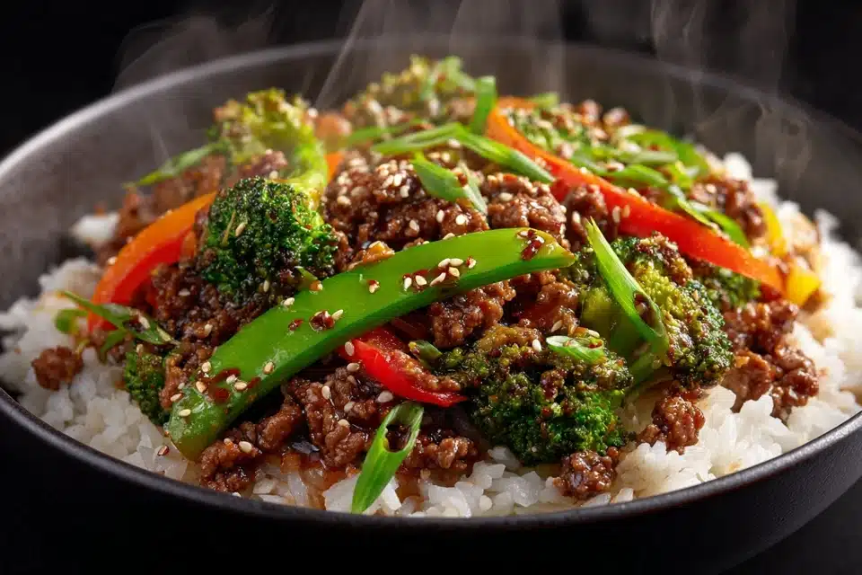 Spicy Ground Beef Stir-Fry Bowl with Garlic Veggies & Steamy Rice – Fast, Fiery, and Filling in 25 Minutes