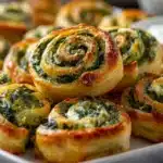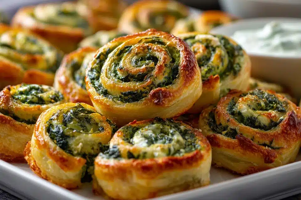 Flaky puff pastry pinwheels filled with spinach, feta, and herbs, baked until golden and crisp.