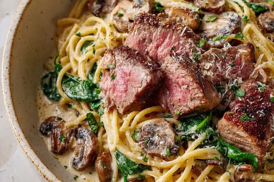 A rich, easy pasta dish with juicy seared steak strips and a creamy garlic-Parmesan sauce—perfect for quick weeknight dinners.