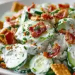 Crisp cucumbers, smoky bacon, shredded cheese, and crunchy crackers tossed in a creamy ranch dressing for a refreshing, addictive salad.