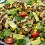 Santa Fe Salad with Chicken is a hearty southwest-style salad with seasoned chicken, beans, corn, vegetables, and a creamy lime dressing.
