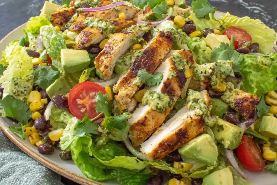 Chicken is the main protein in this salad. Boneless chicken breast is commonly used because it cooks quickly and absorbs seasoning well. It is typically coated in a blend of spices inspired by southwestern cooking, including chili powder, cumin, paprika, garlic powder, salt, and black pepper. This seasoning gives the chicken a smoky and slightly earthy flavor that defines the salad.