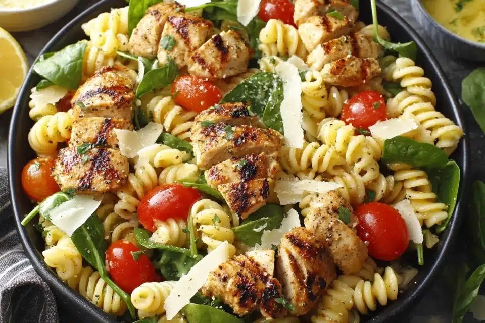 Chicken is the protein centerpiece of Lemon Parmesan Chicken Pasta Salad. Grilled or pan-seared chicken breast works best, offering a tender texture and mild flavor that pairs well with the lemon and Parmesan. Rotisserie chicken can also be used for convenience.