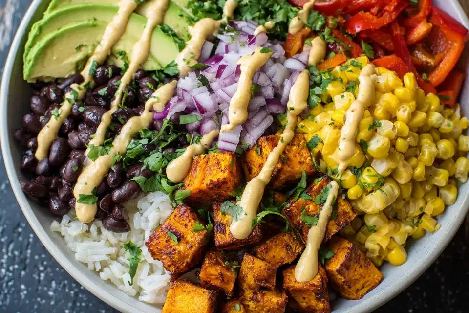 Whether you’re vegan, looking to add more plant-based meals to your week, or just craving something bold and wholesome, this burrito bowl is a guaranteed crowd-pleaser. The roasted sweet potatoes add natural sweetness, while the beans and rice make it filling and protein-rich. Add crunchy veggies, zippy lime, and a drizzle of creamy sauce, and you’ve got a balanced bowl that hits every craving.