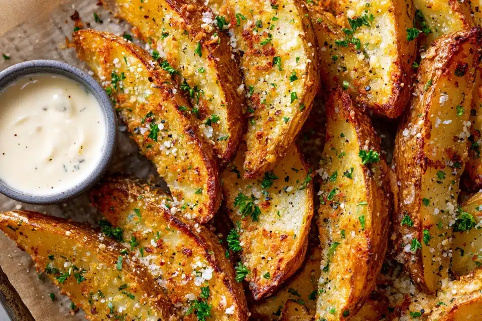 Crispy baked potato wedges tossed in garlic, herbs, and Parmesan—perfectly golden and packed with flavor.