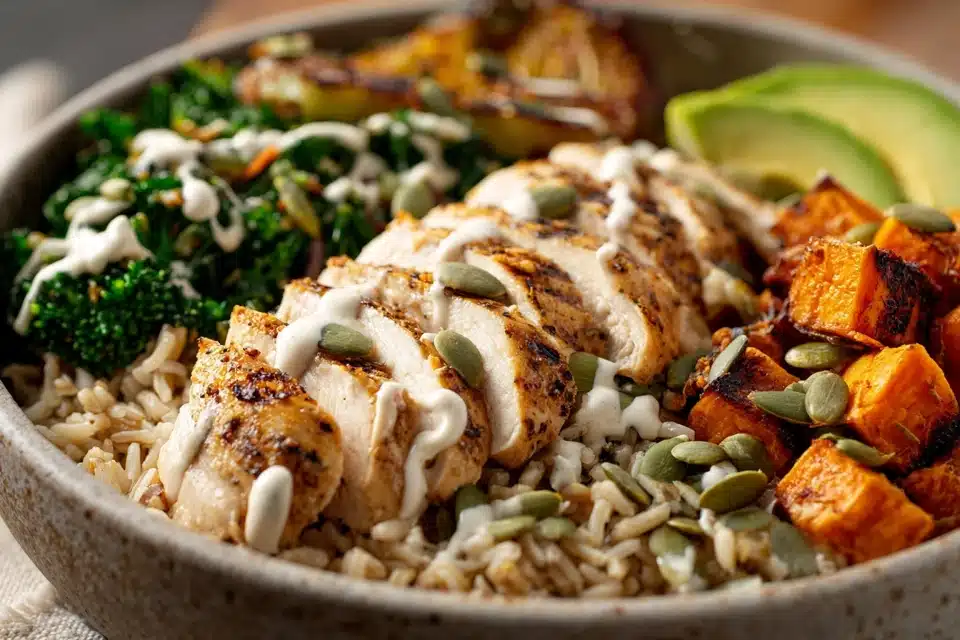 A nourishing rice bowl filled with grilled chicken, roasted sweet potatoes, crisp veggies, and a light tahini or yogurt dressing—perfect for healthy dinners or meal prep.