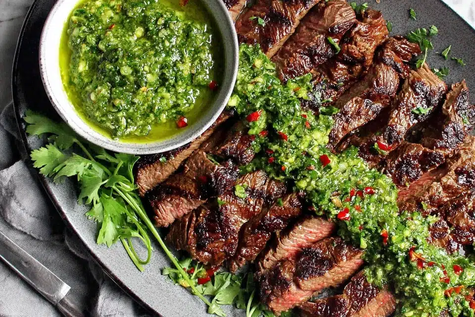 Skirt Steak Marinade with Chimichurri is a bold, herb-forward grilled steak dish featuring a deeply seasoned marinade and a fresh green sauce spooned over hot sliced beef. The skirt steak absorbs garlic, citrus, and spice before hitting a hot pan or grill, creating a caramelized crust with a juicy interior.