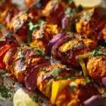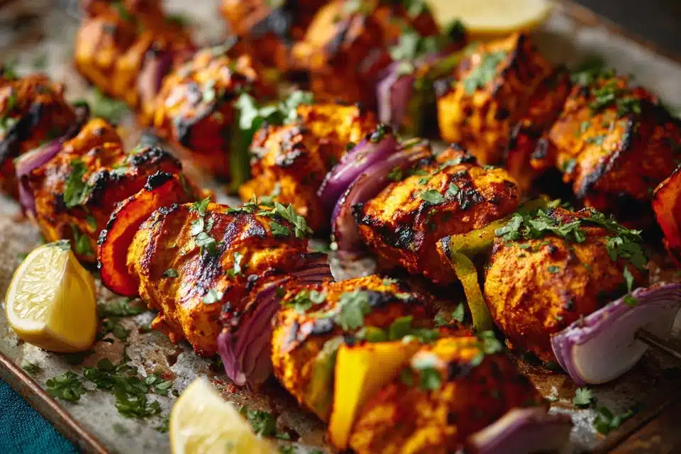 Tandoori Chicken Tikka Skewers feature yogurt-marinated chicken seasoned with traditional Indian spices and grilled until smoky, tender, and lightly charred.
