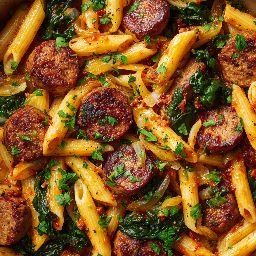 A hearty, spicy pasta dish made with seared hot Italian sausage, garlic, tomato sauce, and spinach tossed with penne. A flavorful, protein-rich dinner perfect for cozy weeknights.