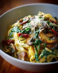 Sometimes the simplest meals are the most satisfying. This pasta dish brings together earthiness from mushrooms, freshness from spinach, and depth from garlic and herbs—all tied together with just a touch of parmesan or vegan cheese if desired.