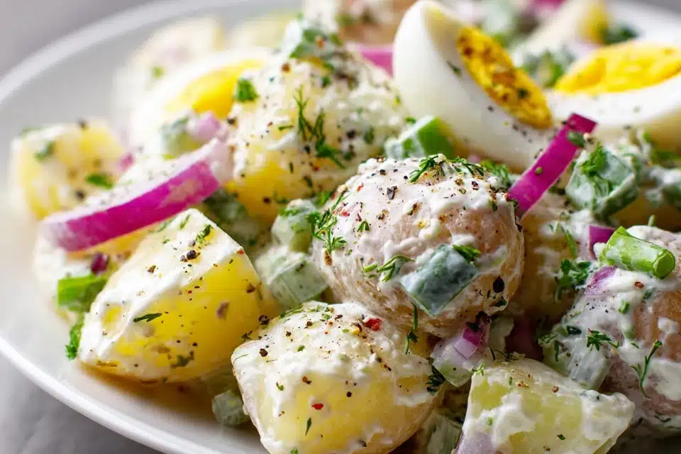 The creamy dressing is made with mayonnaise and sour cream for richness, balanced with mustard and vinegar for tang. Seasonings such as salt, black pepper, and paprika enhance the flavor and give depth. Add-ins like celery, red onion, and pickles provide crunch and subtle flavor contrast, while fresh herbs like parsley or chives contribute freshness and color.