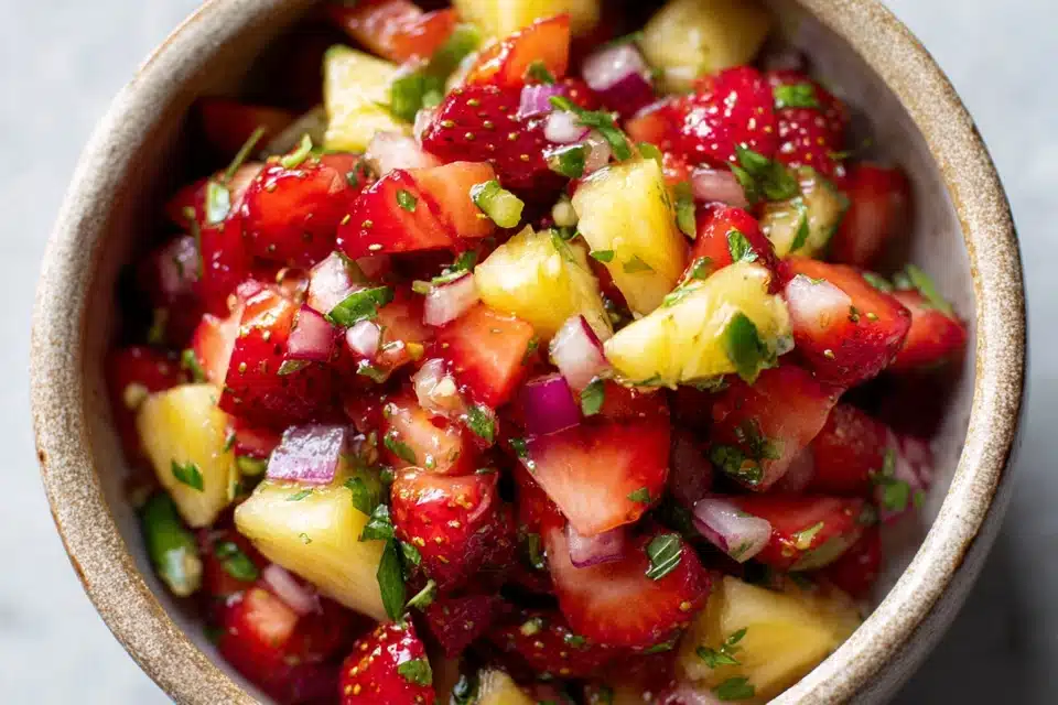 A fresh, tropical salsa combining sweet strawberries, juicy pineapple, and zesty lime with optional heat from jalapeño.