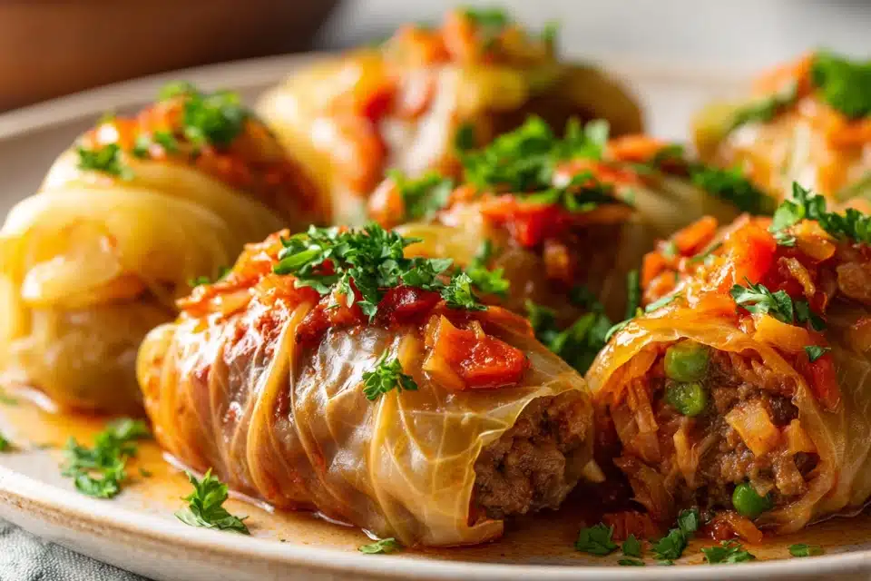 Stuffed Cabbage Rolls with Ground Beef and Vegetables are a timeless comfort food — warm, savory, and filled with flavor in every bite. Originating in Central and Eastern European kitchens, this beloved dish is known for its tender cabbage leaves wrapped around a delicious filling of seasoned beef, vegetables, and rice, all simmered in a rich tomato sauce.