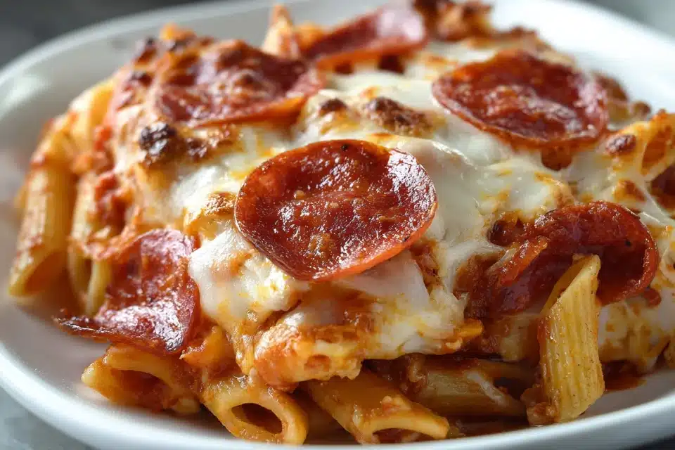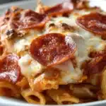 Imagine tender pasta tossed with marinara sauce, loaded with classic pizza toppings like pepperoni and melted mozzarella, then baked until golden and gooey. It’s everything you love about pizza night… but with pasta!