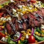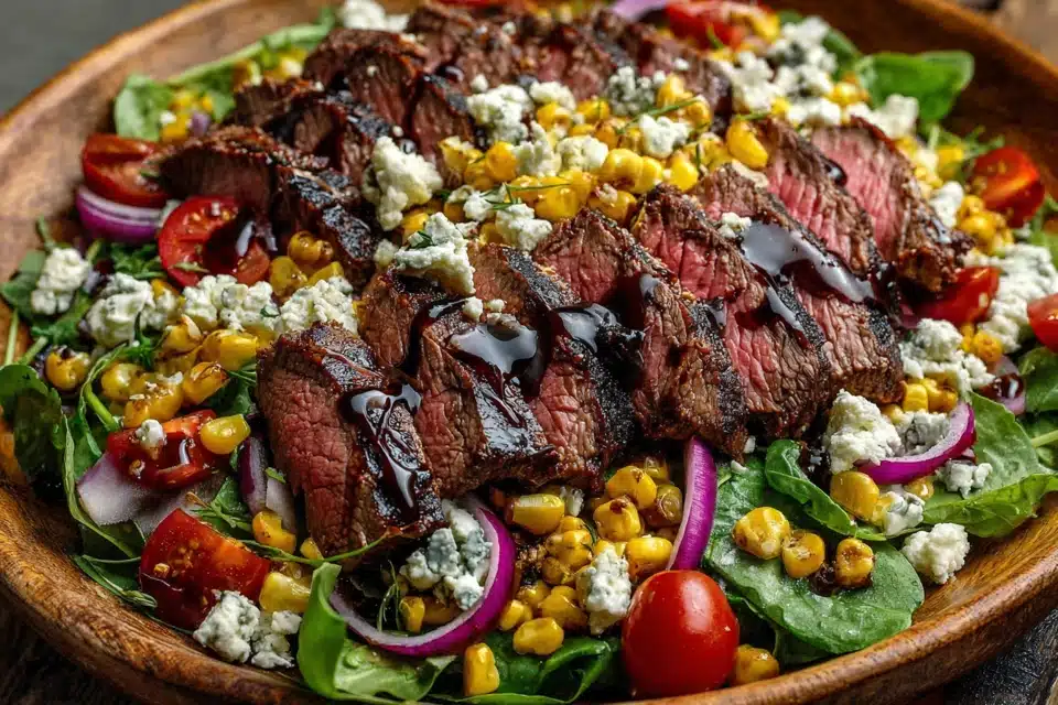 Ultimate Grilled Balsamic Steak Salad with Creamy Gorgonzola & Sweet Corn brings together smoky grilled beef, crisp greens, and vibrant summer flavors in one satisfying bowl. Tender slices of balsamic-marinated steak rest over fresh lettuce, juicy tomatoes, and charred corn, creating a balance of hearty and refreshing.