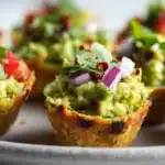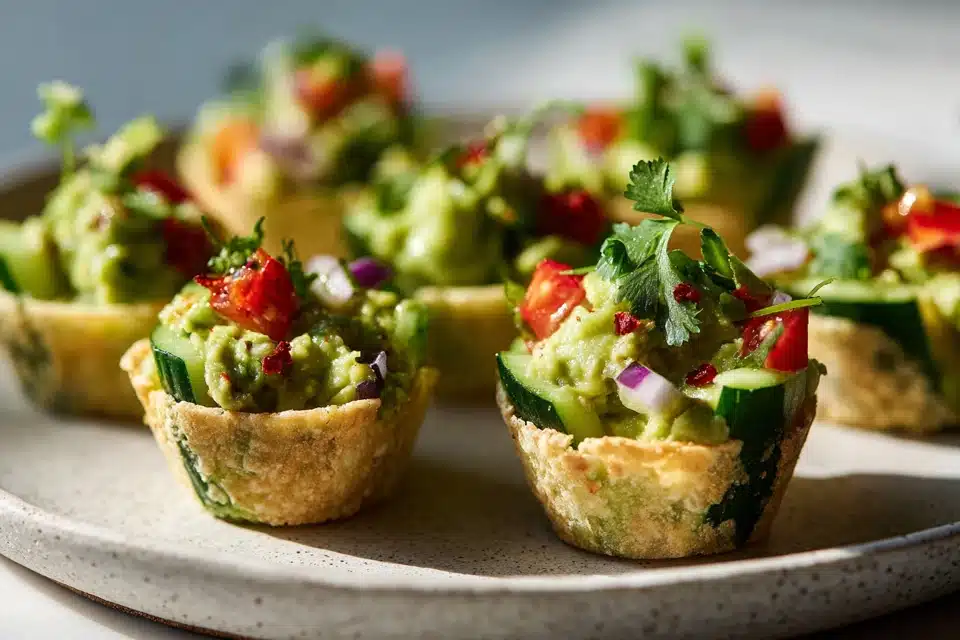 Fresh and creamy Vegan Guacamole Cups served in crisp bite-sized shells, perfect for snacks or gatherings.