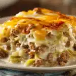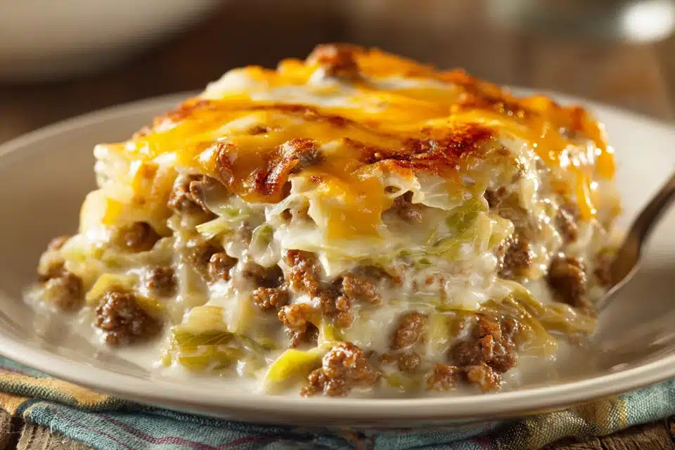 This cozy creamed cabbage and ground beef casserole features tender cabbage, savory beef, and a rich, cheesy cream sauce baked to golden perfection.